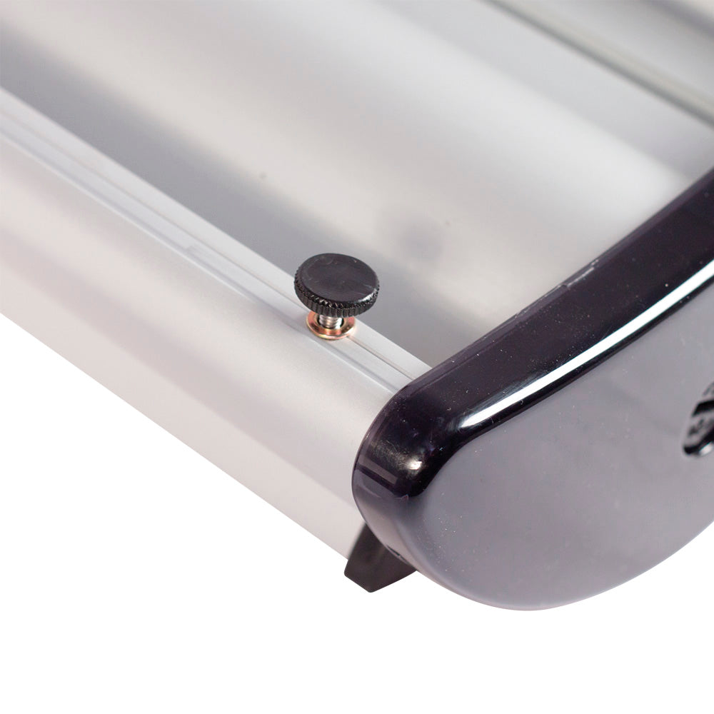 Featuring a stylish anodised aluminium base with subtle pinstripe detail and distinctive smoked grey end trims, Barracuda combines elegance with strength. The hybrid telescopic pole allows easy height adjustment, while levelling feet ensure perfect positioning on uneven floors. The snap top rail and ratchet tensioner enable quick, accurate graphic fitting and smooth retraction.