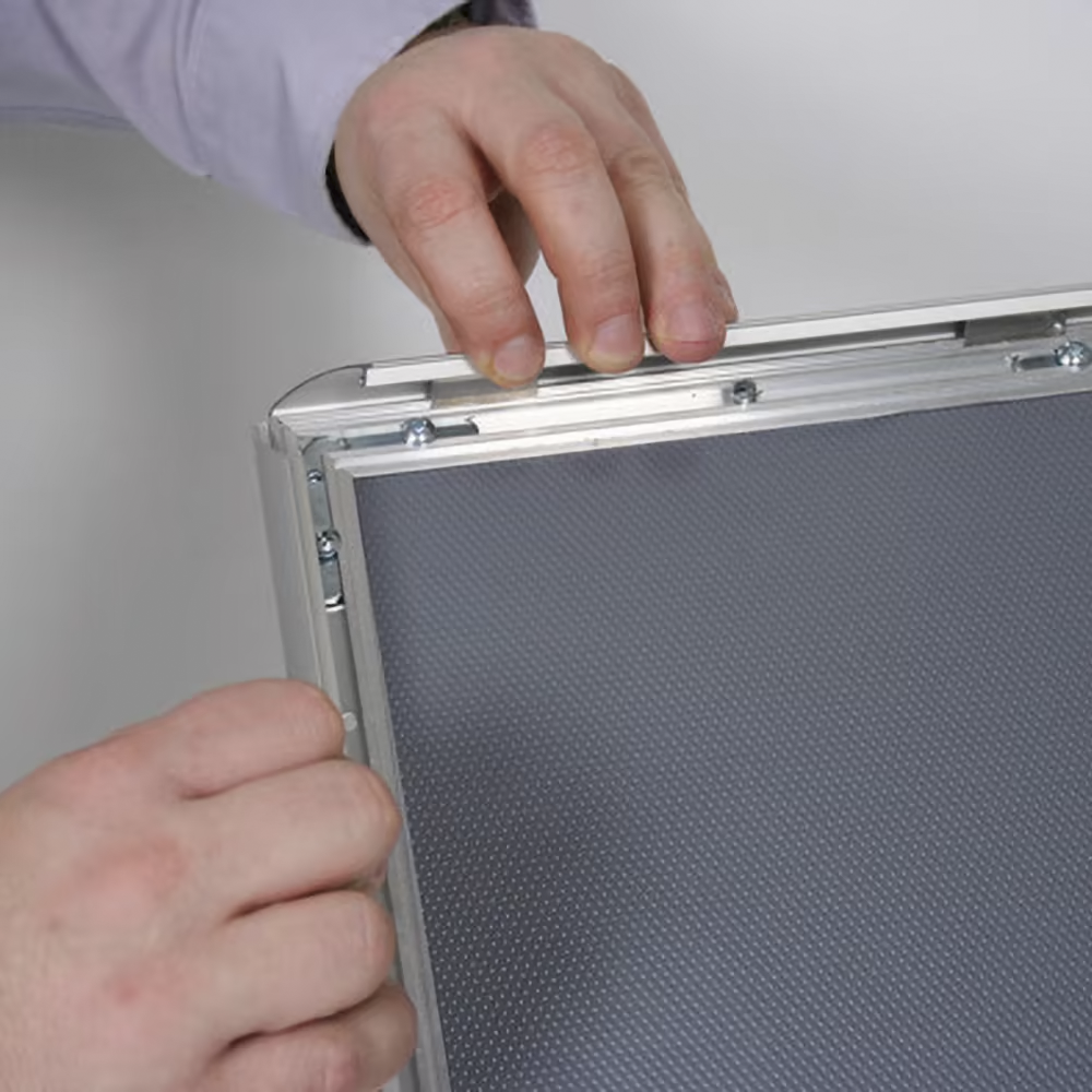 Constructed from anodised silver aluminium with chrome corners for a polished look. Accepts posters up to 420 microns thick and includes a clear PVC cover to protect graphics from scuffs and wear.