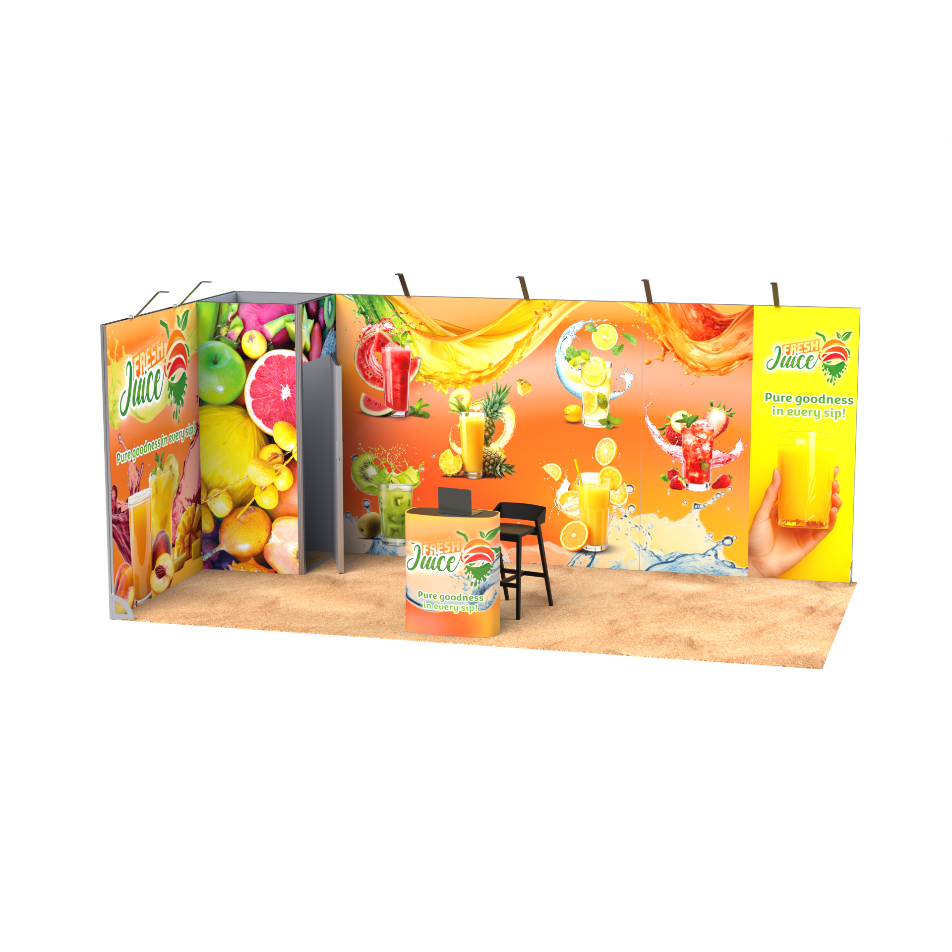 From integrated storage areas to eye-catching arches and curved walls, Vector adds architectural interest and standout style to any display. Stretch fabric SEG graphics deliver a flawless, frameless look, available single or double-sided with optional blackout lining for added visual impact in high-light settings.